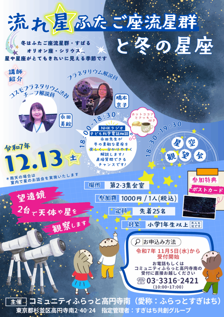 有料 望遠鏡で天体や星を観察「流れ星ふたご座流星群と冬の星座」NHKラジオ:子ども科学電話相談の永田先生が解説! チラシのPDFはこちら -