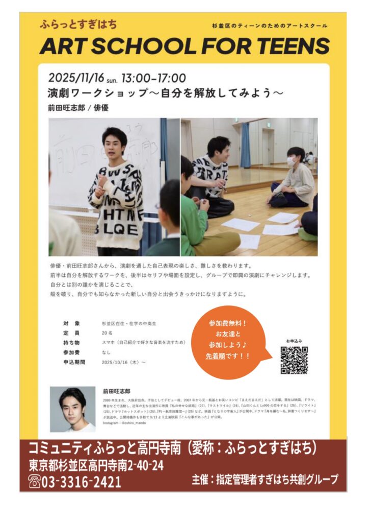 無料 「演劇ワークショップ」~自分を解放してみよう~俳優/前田旺志郎 チラシのPDFはこちら 開催日2025年11月16日(日)開催時間13:00~17:00料金無料申込み期間2025年10月16日(木)~申込み方法以下URLより必要事項を入力し送信してくださいhttps://x... -