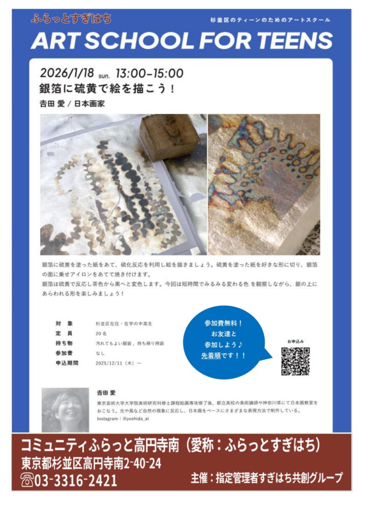 無料 「銀箔に硫黄で絵を描こう!」吉田愛/日本画家 チラシのPDFはこちら 開催日2025年1月18日(日)開催時間13:00~15:00料金無料申込み期間2025年12月11日(木)~申込み方法以下URLより必要事項を入力し送信してくださいhttps://x.gd/QnUzt定員杉並... -