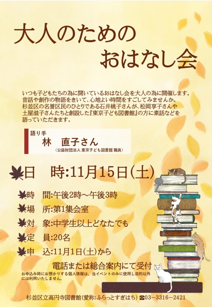無料 「大人のためのおはなし会」語り手/林 直子さん チラシのPDFはこちら -