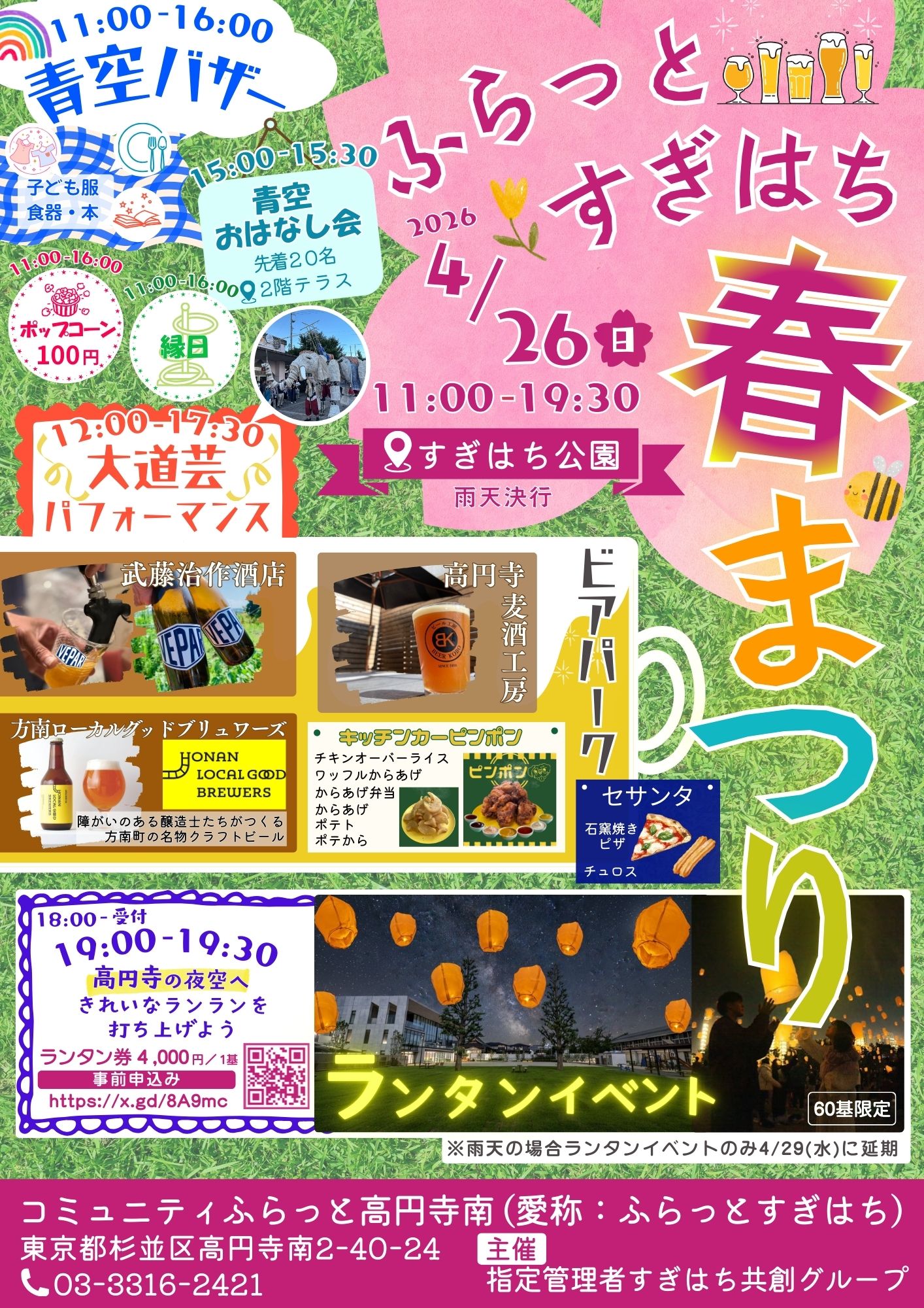 「ふらっとすぎはち春まつり」青空バザー・青空おはなし会・大道芸・ビアパーク・ランタンイベント