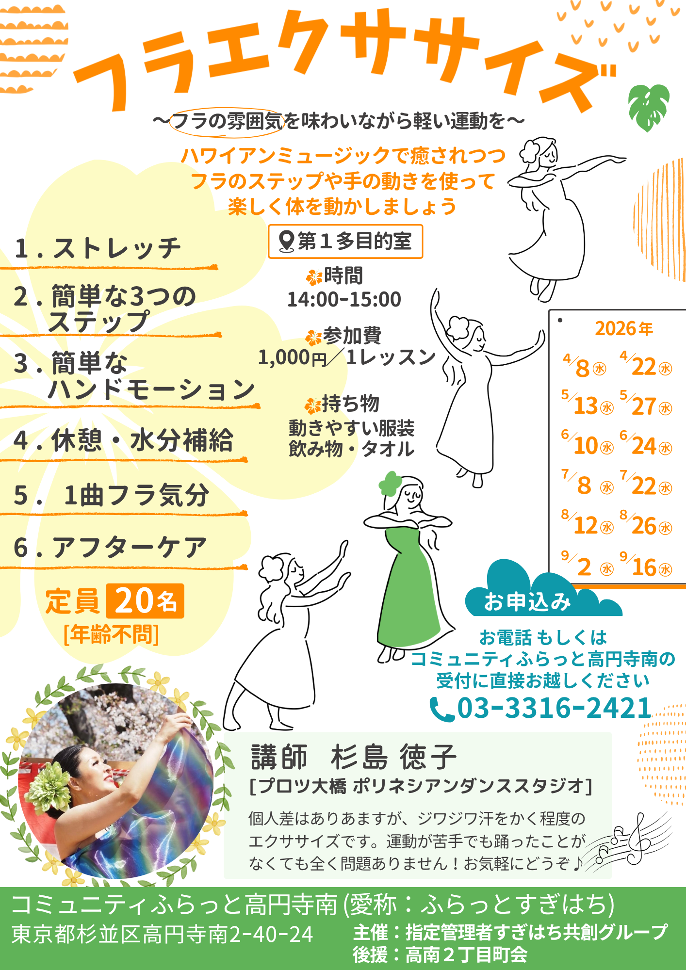 「フラエクササイズ」開講! 2026 3/03 news 2026年4月9日 無料 「フラエクササイズ」フラの雰囲気を味わいながら軽い運動を \ クリックで拡大 / チラシのPDFはこちら お知らせ一覧へ news