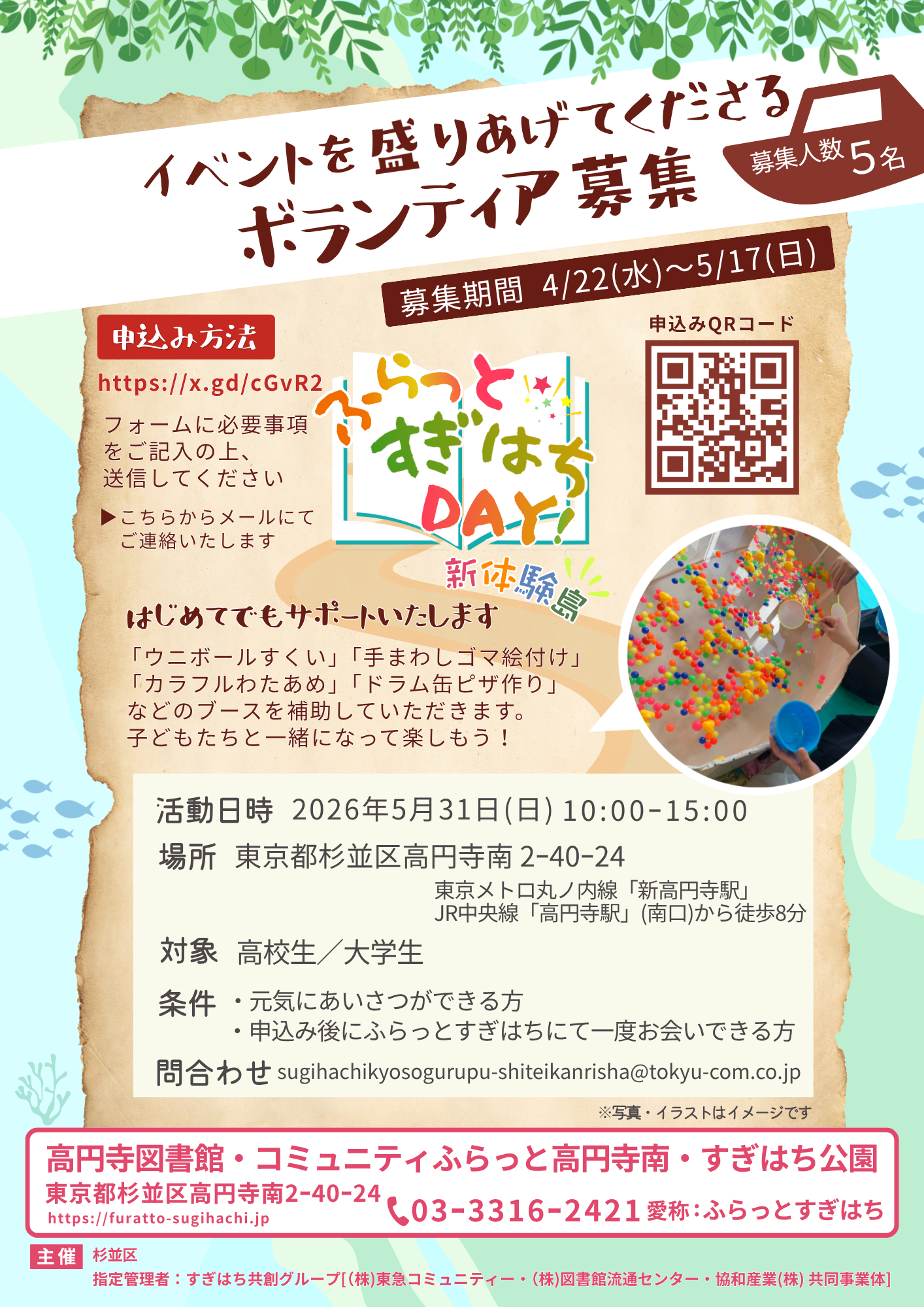 | ボランティア募集 【申込み】 | 申込みURL> https://forms.office.com/r/SCa43vuacN?origin=lprLink |